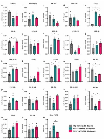 Next, we focused on 60-day-old mice to investigate the dysregulations of lipid metabolism caused by human FUS overexpression and how ACY-738 treatment impacted these alterations. First, we examined the concentration profile of lipid classes and looked for possible enrichment or diminution of whole specific lipid classes. Therefore, we transformed the absolute concentrations in picomoles to the percentage of moles per sample for each lipid, allowing us to directly compare samples with different total lipid amounts. To determine the concentration of each lipid class, we summed individual lipid species concentrations in mol% of samples. Among the 22 lipid classes analyzed, 6 presented significant alterations between the different groups (Figure 2). We observed significantly increased concentrations in vehicle- and ACY-738-treated FUS+/+ mice compared to vehicle-treated nTg controls for three classes of lysophospholipids, specifically lyso-phosphatidylcholine (LPC), lysophosphatidylethanolamine-ether linked (LPE O-), and lyso-phosphatidylserine (LPS) (Figure 2h,k,m). Furthermore, phosphatidic acid (PA) concentrations were decreased in 60-day-old vehicle- and ACY-738-treated FUS+/+ mice compared to vehicle-treated nTg controls (Figure 2o). Interestingly, the alterations of three other lipid classes in FUS+/+ mice were totally or partially rescued by the ACY-738 treatment. Indeed, the decreased concentrations of cardiolipin (CL) and phosphatidylinositol (PI) in vehicle-treated FUS+/+ mice were totally rescued in ACY-738-treated FUS+/+ mice (Figure 2f,t). Moreover, the increased concentrations of cholesterol esters (CE) in vehicle-treated FUS+/+ mice were partially rescued by ACY-738 treatment (Figure 2e).