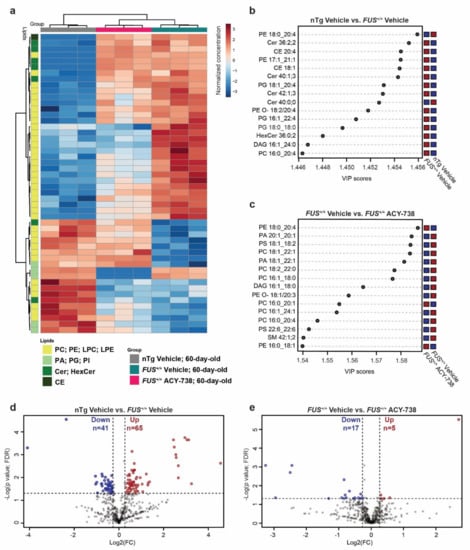 A heatmap displaying the 50 most dysregulated lipid species among the 3 experimental groups of 60-day-old mice showed enrichment of lipid species belonging to the glycerophospholipid category (42 out of 50). ACY-738 treatment was able to mitigate the increased or decreased concentrations of 24 lipid species out of 42. Interestingly, among these 24 lipid species, 22 were lipids with a choline or ethanolamine headgroup (Figure 3a). These observations were further confirmed by partial least squares discriminant analysis and the generation of a variable of importance in the projection score plot (VIP). This analysis allows estimating which lipids contributed most significantly to the differences observed between groups (Figure 3b,c). PC and PE lipids mainly contributed to the differences between 60-day-old vehicle-treated nTg controls and FUS+/+ mice and between vehicle- and ACY-738-treated FUS+/+ mice. Interestingly, CE and ceramides (Cer; HexCer) participated in the differences between vehicle-treated nTg controls and FUS+/+ mice, but not between vehicle- and ACY-738-treated FUS+/+ mice. These results indicate that ACY-738 treatment targets specific lipid classes, namely PC and PE. Next, we used volcano plots to display the most dysregulated lipids among the whole lipidome, with an adjusted p < 0.05 and a fold change FC > 1.2 (Figure 3d,e). We found 41 lipids with significantly decreased concentrations and 65 with significantly increased concentrations in vehicle-treated FUS+/+ mice than nTg controls. Among these, 23 out of 41 and 46 out of 65 were lipids with a choline or ethanolamine headgroup. In ACY-738-treated FUS+/+ mice compared to vehicle-treated FUS+/+ mice, we observed 17 lipids with significantly decreased concentrations and 5 with significantly increased concentrations. Remarkably, we also observed the dysregulation and restoration by ACY-738 of several diacylglycerol (DAG) species, essential intermediates in the synthesis of glycerophospholipids. Fold change relative to nTg controls and concentrations in mol% of samples of these significantly dysregulated lipids are presented in the Supplementary Information (Supplementary Figures S2 and S3).