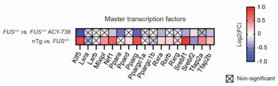 Lipid homeostasis involves several metabolic pathways through which lipid species are synthesized or degraded. Master transcription factors regulate the transcriptional activity of the genes implicated in these pathways. Activation of these regulatory proteins leads to a cascade of transcriptional activation, which ultimately conducts to a particular phenotype. We analyzed the expression of the most important transcription factors involved in lipid metabolism (Figure 5). Based on the literature, we selected 17 genes coding for transcription factors [40,41]. Among them, 11 were dysregulated in the spinal cord of 60-day-old FUS+/+ mice compared to nTg controls. Interestingly, we noted the upregulation of the expression of 10 out of 11 of these transcription factors, meaning that human FUS can activate a set of master transcription factors related to lipid metabolism in the mouse spinal cord. Furthermore, ACY-738 treatment significantly induced the downregulation of seven of these transcription factors, namely Klf5, Nrf1, Ppara, Pparg, Rxra, Srebf1, and Tfap2b. Furthermore, HDAC inhibition restored the expression of the only downregulated gene in 60-day-old FUS+/+ mice, namely Srebf2.