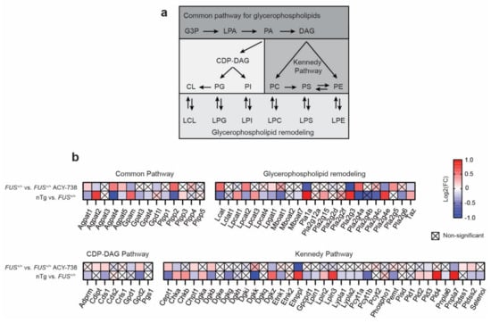 Glycerophospholipids arise from a common pathway initiated by glycerol 3-phosphate (GP3), which is converted to lysophosphatidic acid (LPA), next converted to phosphatidic acid (PA). Subsequently, PA is metabolized into two types of diacylglycerol (DAG) to incorporate two pathways: the CDP-DAG pathway synthesizing PI, PG, and CL, and the Kennedy pathway producing PC, PE, and PC. Glycerophospholipids contain two acyl chains that can be changed by remodeling through the generation of lysophospholipids, creating the diversity of glycerophospholipid composition (Figure 6a). We detected and selected 82 genes coding for enzymes implicated in glycerophospholipid metabolism based on the KEGG pathway map 00564 [42] (Figure 6b). Among these 82 genes, 56 were found dysregulated by human FUS overexpression, of which 21 and 35 genes show increased and reduced expression, respectively. Each pathway of glycerophospholipid biosynthesis was affected, indicating a global effect. Strikingly, we observed that the ACY-738 treatment significantly restored the gene expression alterations of 25 enzymes. Notably, HDAC inhibition targeted genes encoding enzymes that catalyze the conversion of lysophospholipid to phospholipid by adding an acyl group to the glycerol backbone (Agpat1, 2, 4 and 5, Lcat, Lpcat1, Lpcat2, Taz), genes encoding phospholipases (Pla1a, Pla2g3, Pla2g4a, Pla2g4e, Pnpla7) and genes encoding enzymes implicated in the Kennedy pathway (Cept1, Chka, Chpt1, Dgkb, Dgkz, Etnppl, Pld3, Ptdss2).