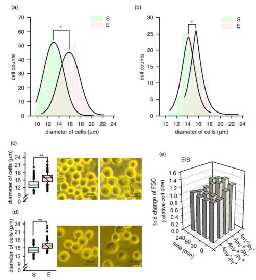 The increase in the size of the TM3 cells due to nsPEF treatment. S: sham-exposed cells. E: nsPEF-exposed cells. (a) Cell diameter distribution within the samples S and E in three independent experiments, with a total of 450 cells scored for each type of sample. The data were collected 5 min after the treatment. (b) Cell diameter distribution within the samples S and E in one independent experiment, with 150 cells scored for each sample. The data were collected 240 min after the treatment. (a,b) The solid line shows the Gaussian regression for the given data. (c,d) The cells’ diameter in samples S and E displayed as box plots (a median value, box: 25th and 75th percentiles (bottom and top of the boxes). Whiskers: 5th and 95th percentiles) together with the corresponding images of cells recorded using the inverted optical microscope. The data corresponds to plots (a,b), respectively. (e) The fold change of forward scatter (FSC) (relative size) of nsPEF-exposed cells after the Annexin V-Alexa Fluor 488 and propidium iodide staining compared to the sham-exposed cells stained as above. The FSC signals were recorded at 0, 30, 60, and 240 min after nsPEF exposure with flow cytometry. The independent experiments were performed five (at 0 min), three (at 30 min), and two (at 60 and 240 min) times. Standard deviations for the values in the graph have been presented separately (Table S1) to ensure data legibility. The asterisk represents the significant difference: * p < 0.0001 in the Kolmogorov–Smirnov test, and ** p < 0.001 in the Student’s t-test, between the sham and exposed samples.