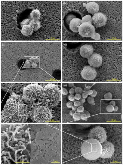 While examining cell morphology with SEM, the cells should be attached to a surface and dehydrated. During the procedure’s subsequent steps, damaged nonadherent cells can be washed away and omitted from observations. In our study, we filtered cell suspensions through a polymer membrane with a pore size of 8 μm. This innovative approach allowed for preserving the entire population and reduced the washout of dead and poorly adhesive cells.