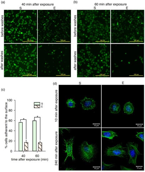 Adhesion and actin cytoskeleton of TM3 cells. S: sham-exposed cells. E: nsPEF-exposed cells. (a,b) Wash assay: TM3 cells were stained with calcein-AM before nsPEF exposure, seeded on the plastic surface, and visualized by epifluorescence microscopy before and after washes. The wash assay was carried out at 40 (a) and 60 min (b) after nsPEF exposure. Healthy intact cells were observed without the exposure (S samples, left panels), and two populations were visible after nsPEF exposure (E samples, right panels): cells with high calcein fluorescence intensity that attached to the surface, and cells with a diminished calcein staining that were mostly washed out. The yellow bar represents 100 μm. (c) Differences in cell attachment between sham- and nsPEF-exposed samples were detected in the wash assay at 40 min and 60 min after treatment. The bars represent the percentage of cells that adhered to the surface (mean value ± SD of three biological replicates, each in three technical repetitions). Asterisk represents the significant difference between the fractions of cells adhering to the surface in sham- and nsPEF-exposed samples at 40 and 60 min (* p < 0.001, Student’s t-test). (d) Actin cytoskeleton stained with phalloidin-Alexa Fluor 488 (green), and the nucleus stained with Hoechst (blue). The cells were fixed after 10 min (upper row), and 240 min (lower row), post-treatment, and visualized under CLSM. The white bar represents 10 µm.