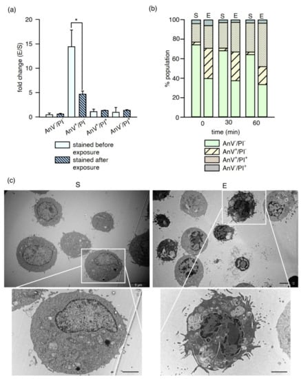 The presence of phosphatidylserine and other apoptosis-related changes in TM3 cells. S: sham-exposed cells. E: nsPEF-exposed cells. (a) The presence of phosphatidylserine on the membrane’s outer leaflet of cells stained with AnnexinV-Alexa Fluor 488 (AnV) and propidium iodide (PI) before the treatment with nsPEF, and immediately after treatment. Four populations of TM3 cells were distinguished by flow cytometry, and 10,000 events were recorded for each sample. The results are expressed as fold changes relative to sham-exposed samples. The bars represent median value and the 75th percentile of five (cells stained before exposure), or four (cells stained after exposure), independent experiments, with three biological repetitions per condition; the difference was significant (Student’s t-test (* p < 0.05)) for AnV+/PI- cells. (b) The phosphatidylserine’s externalization at the surface of cells stained before the nsPEF treatment, as described above; the percentage of cell populations in the samples S and E during 60 min post-exposure. The mean value of five (at 0 min), three (at 30 min), or two (at 60 min) independent experiments, with three biological repetitions per condition. (c) TEM images of sham- and nsPEF-exposed TM3 cells. Healthy cells with intact plasma and nuclear membranes predominate in sham-exposed control samples (left column). Numerous cells with morphological signs of apoptosis, such as nuclear membrane damage, chromatin condensation, and irregular cell outline, can be observed after nsPEF treatment (right column). The black bar represents 5 and 2 µm, respectively.
