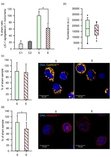 The mitochondria are the organelles most sensitive to the electric field; thus, the mitochondrial membrane potential (ΔΨm) was measured as the JC-1 PE/JC-1 FITC fluorescence intensity ratio in TM3 cells and expressed as the % of the sham sample ratio (Figure 5a). The graph depicts changes in the mitochondrial membrane potential of cells after nsPEF. Two positive controls with valinomycin, the potassium selective ionophore (C1), and carbonyl cyanide m-chlorophenylhydrazone CCCP (C2), a protonophore, were used. Both compounds disconnect oxidative phosphorylation and cause the inner mitochondrial membrane potential to dissipate. ΔΨm was significantly reduced in C1 and C2 controls (respectively, 15.32 ± 9 and 22.21 ± 2.02% sham ratio) when compared to the sham control (S = 100.0 ± 13.21%). Although, to a lesser extent, depolarization of the mitochondrial membrane was also observed in the exposed cells (62.63 ± 14.64 % sham ratio). The difference was significant (Student’s t-test, p < 0.005). Loss of the mitochondrial membrane potential might evidence the increased mitochondrial membrane permeability. However, heterogeneity of the mitochondrial response to nsPEF was observed, since only 49.7% of the exposed cells, versus 32.3% of cells in the sham samples, had a diminished ΔΨm. The corresponding value in the control samples, C1 and C2, was equal to 91.0 and 85.3%, respectively.