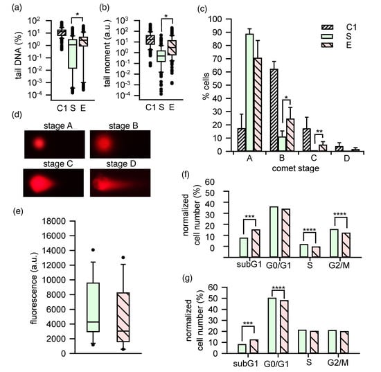 Synthesis and damage of DNA in TM3 cells. S: sham-exposed cells. E: nsPEF-exposed cells. (a–d) The extent of DNA damage was evaluated 30 min after exposure by the neutral comet assay and expressed as (a) tail DNA or (b) tail moment. C1: the cells treated with 350 µM etoposide for 24 h, positive control. Each box shows the median value (the horizontal line within a box) of four independent experiments. The 25th and 75th percentiles are indicated by the bottom and top of the boxes, respectively. Whiskers: 5th and 95th percentiles. A significant difference between sham- and nsPEF-exposed cells was determined with the nonparametric Mann–Whitney U test (* p < 0.001). (c) The percentages of cells in comet stage categories. Each bar shows the mean (±SD) of four independent experiments. Asterisks represent the significance level (* p < 0.001, ** p < 0.05, Student’s t-test) of the difference between the sham and exposed samples. (d) Photomicrographs of four comet stages (A–D) corresponding to nuclear DNA content in the tail observed under an epifluorescence microscope with 20 × objective lens magnification. (e) Synthesis of DNA by TM3 cells assessed with the CyQuant® assay 24 h after exposure. The boxes show the median value of four independent experiments, with three biological replicates per condition. The 25th and 75th percentiles are indicated by the bottom and top of the boxes, respectively. Whiskers: 5th and 95th percentiles. (f–g) The cell cycle phases at 4 h (f) and 24 h. (g) After sham and nsPEF exposure of TM3 cells. Asterisks represent the significance level (*** p < 0.00001, **** p < 0.005, chi-square test) of the differences between the sham and exposed samples.