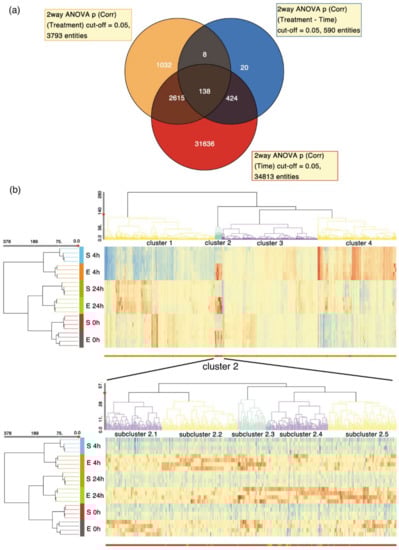 Transcriptome analysis of TM3 cells. S: sham-exposed cells. E: nsPEF-exposed cells. (a) Venn diagram for groups of differentially expressed genes identified by a two-way ANOVA with interaction (independent variables: treatment and time; p < 0.05). Orange circle: treatment-dependent differentially expressed genes. Red circle: time-dependent differentially expressed genes. Blue circle: treatment- and time-dependent differentially expressed genes. (b) Upper panel: unsupervised hierarchical clustering performed for all differentially expressed genes identified by ANOVA. Red colour indicates a relatively higher gene expression, and the blue, a relatively lower gene expression. Clustering on genes and conditions. Similarity measure: Euclidean. Linkage rule: Ward’s. Four main gene clusters are indicated in different colours. Lower panel: close-up of cluster 2 showing five subclusters of genes with a higher expression in nsPEF-exposed samples.