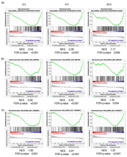 Gene set enrichment analysis for TM3 cells. E0: nsPEF-exposed cells, time 0 h; E4: nsPEF-exposed cells, time 4 h; E24: nsPEF-exposed cells, time 24 h. The most negatively enriched hallmark gene sets identified in the gene set enrichment analysis comparing nsPEF-exposed and sham samples at 0 h (left), 4 h (centre), and 24 h (right) time points. Normalised enrichment scores (NES) and false discovery rate (FDR) q-values are shown below the plots. (a) Hallmark: oxidative phosphorylation; genes encoding proteins involved in oxidative phosphorylation. (b) Hallmark: DNA repair; genes involved in DNA repair. (c) Hallmark: E2F targets; genes encoding cell-cycle-related targets of E2F transcription factors.