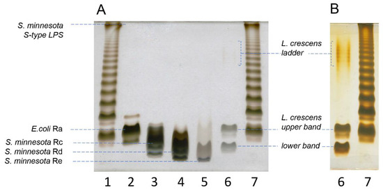 Comparative DOC-PAGE analysis of the LPS from Lcr. Panel (A): LPS from Lcr (Lane 6, 0.5 µg) was run alongside LPS of Salmonella enterica serovar Minnesota S-strain LPS (Lanes 1 and 7, 2 µg); E. coli EH100 (Ra mutant) (Lane 2, 0.5 µg), S. minnesota R5 (Rc mutant) (Lane 3, 0.5 µg), S. minnesota R7 (Rd mutant) (Lane 4, 0.5 µg) and S. minnesota R595 (Re mutant) (Lane 5, 0.5 µg). Panel (B): Overexposure of the gel to silver staining allowed for viewing of the faint higher molecular weight bands from Lcr LPS.