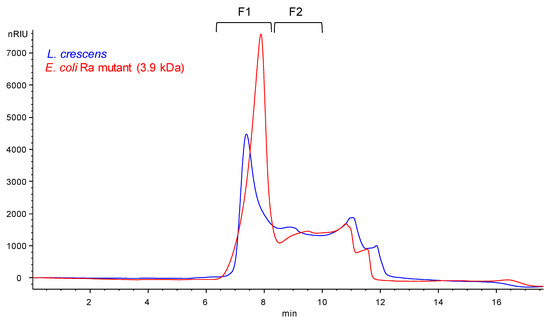SEC chromatogram of the O-polysaccharide released from the Lcr. The chromatogram from Lcr O-polysaccharide was overlaid with the core region released from E. coli EH100 (Ra mutant, 3.9 kDa). Fractions 1 and 2 (F1, F2) indicate two collected fractions that were used for composition analysis.