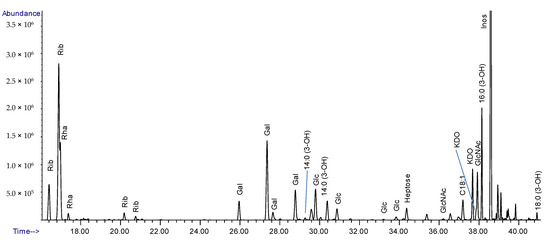The glycosyl and fatty acid composition analysis identified 3-deoxy-α-d-manno-oct-2-ulosonic acid (Kdo), l-glycero-α-d-manno-heptopyranose (Hep), N-acetylglucosamine (GlcNAc), as well as β-hydroxymyristic (14:0 (3-OH)), β-hydroxypalmitic (16:0 (3-OH)), and β-hydroxystearic (18:0 (3-OH)) acids (Figure 3 and Table 1). We also detected ribose (Rib), rhamnose (Rha), galactose (Gal), and glucose (Glc). Repeated RNase digestion and dialysis did not alter the Rib content, indicating that the ribose is an integral part of the LPS and not due to RNA contamination. Other glycosyl residues were rhamnose (Rha), galactose (Gal), glucose (Glc), and N-acetylglucosamine (GlcNAc).
