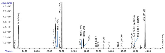 The composition analysis of the released lipid A (Figure 4) gave the same major fatty acids as those in the intact LPS (Figure 3), namely 14:0 (3-OH), 16:0 (3-OH), and 18:0 (3-OH). In addition, the saturated fatty acyl residue C16:0, the unsaturated residue C18:1, and a very-long-chain fatty acid (VLCFA), 27-hydroxyoctacosanoic acid (28:0 (27-OH)), were observed. The presence of VLCFA is consistent with its identification in the LPS from other members of the Rhizobiaceae family [14]. The presence of C18:1 is likely the result of contaminating phospholipids. In addition to the major peaks, several minor fatty acyl peaks were also observed, such as C20:1 and C20:0, etc. (Figure 4).