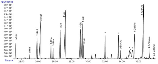 Linkage analysis of the purified LPS from Lcr was also performed (Figure 5 and Table 3). The results of this analysis were consistent with the composition data showing ribose, N-acetylglucosamine, and galactose to be the main residues detected with smaller amounts of rhamnose and glucose also present. The ribose detected in the sample was shown to be exclusively in the furanose form. The N-acetylglucosamine residues are sourced from both the polysaccharide portion of the LPS as well as the lipid A backbone. There were also several peaks whose mass spectra did not correspond to carbohydrates and are therefore marked with asterisks.