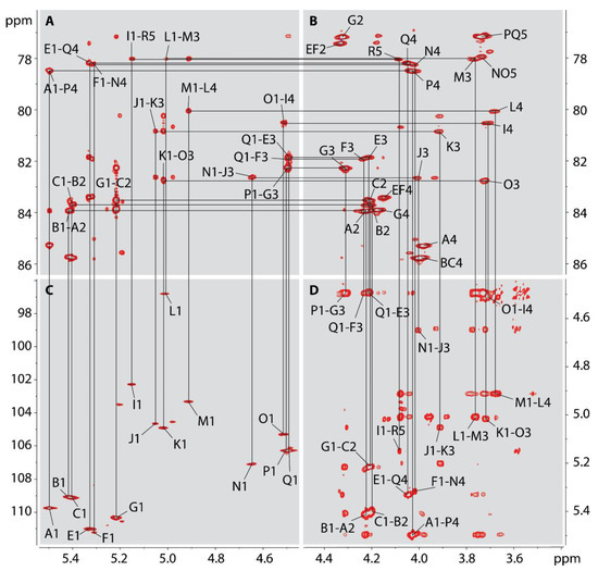 The residues belonging to the major anomeric signals were labeled with letters and assigned using a set of 2-dimensional 1H-1H- and 1H-13C-NMR correlation experiments, including 1H-1H-COSY, TOCSY, and NOESY and 1H-13C-HSQC and HMBC.