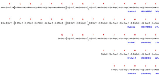 The intensity of the terminal residues S, T, U, V, and W was used to estimate the molar amounts of the five structures present. Then, the expected intensities of all residues were back-calculated using the numbers of residues in, together with the relative molar amounts of each of the five structures (Table 6). A comparison of the calculated with the observed intensities gave reasonably good agreement, confirming the accuracy of the proposed structures. Knowledge of the monosaccharide composition thus obtained of each structure also gave their molecular weights and, together with the molecular weight determined above of the lipid A (~1.8 kDa), the molecular weights of the corresponding LPS/LOS species (Figure 10). The five structures fall into three size categories: LPS structures 1 and 2 are fairly large (~11 kDa), LOS structures 4 and 5 are small (~3 kDa), and structure 3 is of intermediate size (~5 kDa). The abundance ratio of the three categories is about 2:2:1. These observations agree with the DOC-PAGE analysis (Figure 1), which showed two intense bands near the bottom and a weaker band between them. These findings also agree with the SEC results from the delipidated polysaccharides (Figure 2). The gel also showed a very faint ladder of much higher molecular weight. This most likely corresponds to the 3-α-Rhap-1→4-α-GlcpNAc-1→ (M-L) polysaccharide, of which no terminal residues were found as would be expected for a very large polysaccharide.