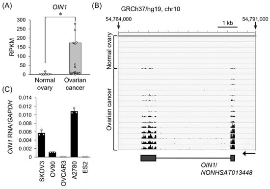Study protocols and patient consent were approved by the Institutional Review Board of Saitama Medical University International Medical Center (#12-096, #13-165). Ovarian cancer and normal tissue specimens were obtained from patients who underwent surgery for primary ovarian tumor. Detailed information for the clinical specimens and RNA-seq methods were described previously [,]. Expression values of RNA-seq were quantified as RPKM based on RefSeq and NONCODE (http://www.noncode.org/ [accessed on 22 January 2021]) gene models []. Among transcripts mapped to NONCODE v4 gene sets, we selected 10 putative differentially expressed lincRNAs, which were particularly upregulated in ovarian cancer compared with normal tissues by ≥10-folds at an FDR adjusted p-value, or q-value threshold <0.05 (Table 1). Among the 10 lincRNAs, NONHSAT013448 designated as OIN1 in this study exhibited the highest expression in ovarian cancer tissues. We screened positively or negatively OIN1-correlated Refseq genes showing correlation coefficients (r) between OIN1 as ≥0.6 or ≤−0.45. Biological pathways enriched among the OIN1-associated genes were analyzed using DAVID Bioinformatics Resources 6.8 (https://david.ncifcrf.gov/summary.jsp [accessed on 22 January 2021]) [].