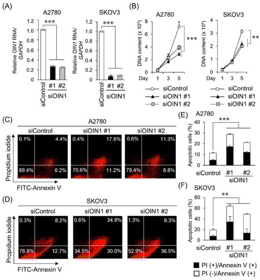 To examine the significance of OIN1 in ovarian cancer, we performed knockdown experiments using OIN1-specific siRNAs (siOIN1 #1 and #2). OIN1 expression was substantially decreased by these siRNAs in A2780 and SKOV3 cells as analyzed by qRT-PCR (Figure 2A). We showed that the siRNA-mediated OIN1 knockdown significantly suppressed the proliferation of these A2780 and SKOV3 cells (Figure 2B). Conversely, the exogenous expression of OIN1 promoted the proliferation of A2780 and SKOV3 cells (Figure S1A–C,F). We next examined whether OIN1 knockdown modulates the apoptosis of ovarian cancer cells. As analyzed by flow cytometry, OIN1 knockdown increased annexin V-positive fractions in A2780 and SKOV3 cells (Figure 2C–F). The expression levels of an apoptosis marker, cleaved PARP1 protein, were increased in OIN1-silenced A2780 and SKOV3 cells (Figure S2A,B). In addition, the mRNA expression of anti-apoptotic B-cell lymphoma 2 (BCL2) was downregulated, and the ratio of the expression of proapoptotic BCL2-associated X, apoptosis regulator (BAX) to BCL2 was increased in OIN1-silenced cells (Figure S2C–H). These results suggest that OIN1 promotes proliferation and suppresses apoptosis of ovarian cancer cells.