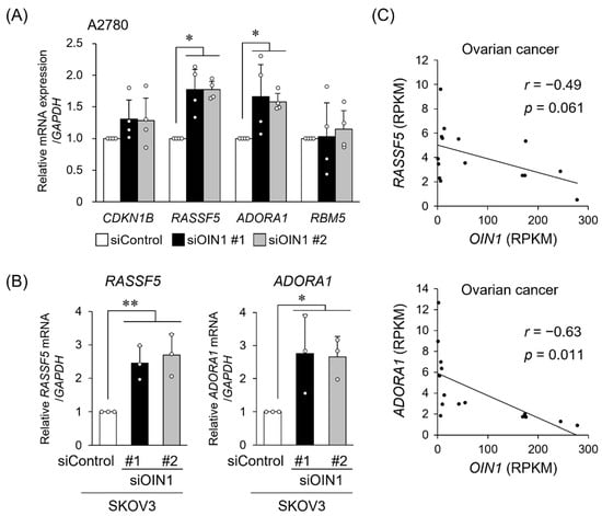 OIN1 regulates expression levels of RASSF5 and ADORA1. (A) Increased expression of RASSF5 and ADORA1 in OIN1-downregulated A2780 cells. A2780 cells were transfected with OIN1 siRNAs (siOIN1 #1 and #2) or siControl. Relative expression levels of selected genes 48 h after siRNA transfection were quantified by qRT-PCR and normalized to GAPDH mRNA levels. Data are presented as mean fold change ± SD in each gene group (n = 4). (B) Increased expression of RASSF5 and ADORA1 in OIN1-downregulated SKOV3 cells. SKOV3 cells were transfected as above, and expression levels of RASSF5 and ADORA1 mRNAs 72 h after siRNA transfection were quantified by qRT-PCR. Data are normalized to GAPDH mRNA levels and presented as mean fold change ± SD in each gene group (n = 3). *, p < 0.05; **, p < 0.01; two-way ANOVA. (C) Relationship between expression levels of RASSF5 or ADORA1 mRNA and OIN1 RNA analyzed using our RNA-seq data for clinical ovarian cancer specimens (n = 15) [,].