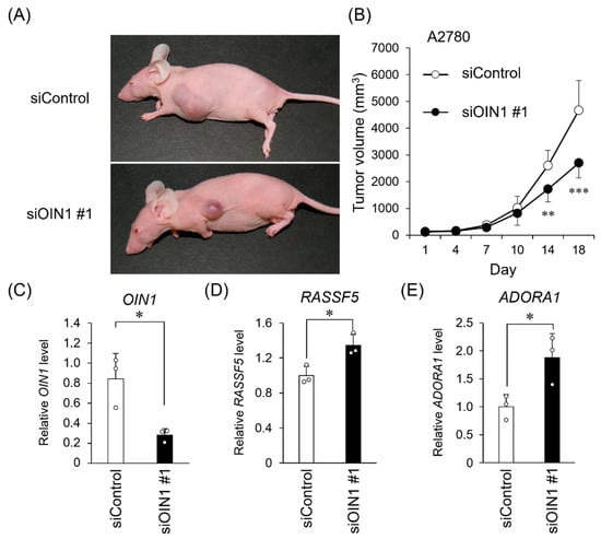 OIN1 siRNA inhibits tumor formation of ovarian cancer xenografts. (A) Athymic mice were subcutaneously xenografted with A2780 cells and, then, siOIN1 #1 (n = 8) or siControl (n = 7) was injected into the tumors twice a week. Representative images of generated tumors after 18 days are shown. (B) Tumor volumes are presented as mean ± SD. (C–E) Relative expression levels of OIN1 RNA (C), RASSF5 (D), and ADORA1 (E) mRNAs in the tumors dissected 18 days after the start of siRNA injection were quantified by qRT-PCR and normalized to GAPDH mRNA levels. Data are presented as mean fold change ± SD versus siControl in tumors (siControl, n = 3; siOIN1 #1, n = 3). *, p < 0.05; **, p < 0.01; ***, p < 0.001; Student’s t-test.