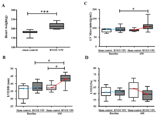 Heart weight, left ventricular mass, left ventricular size, and left ventricular ejection fraction between the RVOT-VPC group and the sham control group at baseline and 6-month follow-up. Heart weight of the RVOT-VPC group was bigger than the sham control group at the 6-month follow-up (p < 0.001) (A). The left ventricular end-diastolic diameter (LVEDD) of the RVOT-PVC group at the 6-month follow-up was significantly larger than that of the RVOT-PVC group at the baseline (p = 0.0022) and that of the sham control group at the 6-month follow-up (p = 0.0101) (B). The LV mass index of the RVOT-VPC group was significantly higher than that of the sham control group at the 6-month follow-up (p = 0.041) (C). There was a trend toward lower LV ejection fraction (LVEF) in the RVOT-PVC group compared to the sham control group at the 6-month follow-up (D). *: p < 0.05; ***: p < 0.001. Blue line to express the trend of difference between Sham control and RVOT-PVC groups at baseline; Red line to express the trend of difference between Sham control and RVOT-PVC groups at the 6-month follow-up.