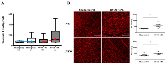 Serum cardiac troponin I, a sarcomere biomarker, was measured in the study pigs. The level of serum cardiac troponin I was elevated in the RVOT-VPC group (n = 6) (Baseline versus 6-month follow-up: 89.22 ± 28.89 vs. 177.3 ± 71.78 pg/mL, p = 0.309) but not in sham control group (n = 6) (Figure 2A).