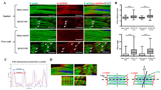 Sarcomere morphology, shear angle at the Z-line and the distance between two Z-lines following 6-month RVOT bigeminy VPCs. (A) Immunohistological studies of left ventricular septal and free wall myocardial tissue showed organized sarcomeres (homogenous distribution of F-actin in the sarcomeres, Z-lines in parallel, and equal distance between Z-lines (stained with α-actinin)) in the sham control group but showed that the sarcomere morphology and Z-line arrangement became disarrayed (non-homogenous distribution of F-actin in the sarcomeres and Z-lines not in parallel and different distances between two Z-lines) and spindle-shaped actin accumulations (white arrow) in the RVOT-VPC group. (B–D). The distance between two Z-lines (sarcomere length) and the shear angle at the Z-line (an indicator of reduced Z-direction contraction) were significantly increased in the cardiomyocytes of RVOT-VPC group compared to sham control group at both locations of left ventricle. The length of sarcomeres was measured as the distance between neighboring Z-lines, i.e., the distance between the neighboring peak immunofluorescent intensities of α-actinin (C). The shear angle at the Z-line was defined as the angle between Z-line and the line parallel to the actin in the same sarcomere, i.e., the angle between α-actinin and F-actin (D). DAPI staining for nuclei. Scale bar = 10 μm. ***: p < 0.001.