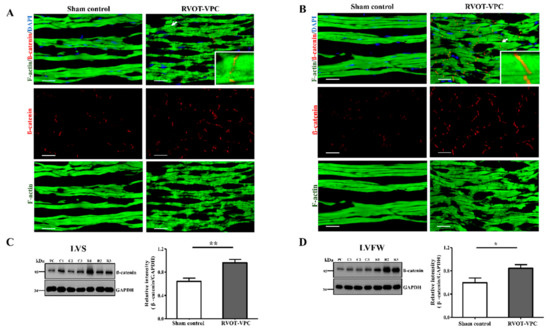 Immunohistological and immunoblotting studies of the expression of β-catenin in the RVOT-VPC group and sham control group at left ventricular septum (LVS A,C) and left ventricular free wall (LVFW B,D. The expression of β-catenin at intercalated discs significantly increased in the RVOT-VPC group than in the sham control group at LVS (A,C) and LVFW (B,D). In addition, the spindle-shape actin accumulation was located at the intercalated discs with β-catenin (insert) (white arrow at right upper panel in (A,B). DAPI staining for nuclei. Scale bar = 10 μm. *: p < 0.05 and **: p < 0.01. PC: positive control.