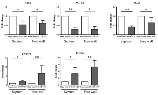 Five differentially expressed genes related to actin cytoskeleton signaling induced by 6-month RVOT bigeminy VPCs in the septum and free wall of left ventricle. Five genes that were differentially upregulated or downregulated in the RVOT-VPC group compared to the sham control group according to next generation sequencing analysis results were selected and studied. The expressions of RAC2, ACTG2, and ITGA4 were downregulated while the expressions of CYFIP2 and FGF16 were upregulated in the RVOT-VPC group compared to sham control group. *: p < 0.05 and **: p < 0.01.