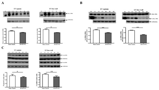 The midmyocardial layer of the septum and free wall of the LV at the level of the papillary muscle were dissected after sacrifice at 6-month follow-up in the RVOT-VPC and sham control groups. To identify the profile for the differentially expressed genes (DEGs) in the LV of the VPC pigs, a total of three different LV septal and free wall tissues derived from three VPC pigs were compared with three different LV septal and free wall tissues derived from three sham control pigs. A total of 634 genes were identified to have more than a 1.5-fold change in the LV septal tissues between the VPC pigs and the sham control pigs, i.e., a total of 269 genes were differentially upregulated by the altered fold change > 1.5 (Log2FC (RVOT-VPC/sham control) > 0.58) (Supplemental Table S1), and 365 were differentially downregulated by the altered fold change < 0.66 (Log2FC (RVOT-VPC/sham control) < −0.58) (Supplemental Table S2). A total of 557 genes were identified to have more than a 1.5-fold change in the LV free wall tissues between the VPC pigs and the sham control pigs, i.e., a total of 330 genes were differentially upregulated by the altered fold change > 1.5 (Log2FC (RVOT-VPC/sham control) > 0.58) (Supplemental Table S3), and 227 genes were differentially downregulated by altered fold change < 0.66 (Log2FC (RVOT-VPC/sham control) < −0.58) (Supplemental Table S4). The heat map graphs are depicted in Supplemental Figure S2A,B.