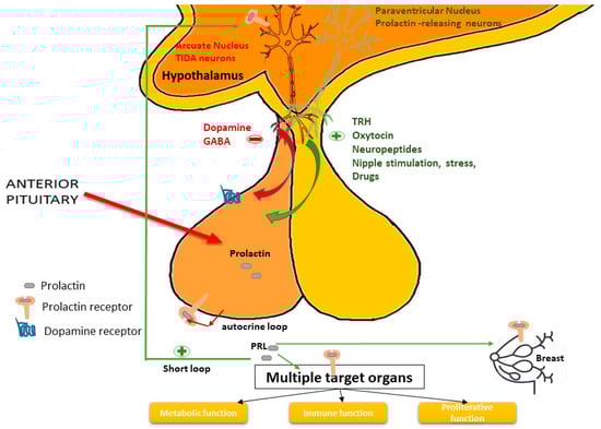 PRL secretion is mainly under inhibitory stimuli, via tuberoinfundibular dopamine (TIDA) neurons in the hypothalamus binding to Type 2 Dopamine Receptor (D2R) and GABA (gamma aminobutyric acid), the latter playing a minor role [21]. PRL also controls its own secretion through a short loop negative feedback, stimulating TIDA cells [22] and in the own lactotroph cell by an autocrine loop [23] (Figure 2). There are also prolactin-releasing factors (PRFs) such as thyrotropin-releasing hormone, vasoactive intestinal peptide, serotonin, histamine, oxytocin and oestrogens [24]. Nevertheless, the nature of the physiological PRF is unclear [24]. Nipple stimulation, light, olfaction, and stress, stimulate prolactin secretion. Other neurotransmitters and neuropeptides can also modulate PRL secretion (for example endothelin, TGF beta1, angiotensin, somatostatin, substance P, neurotensin, calcitonin, EGF, natriuretic atrial peptide, bombesin, cholecystokinin, acetylcholine, and vasopressin) [25,26,27]. Among medications that increase serum PRL, dopamine receptor antagonists such as neuroleptics (i.e., sulpiride, haloperidol, chlorpromazine, risperidone) and antiemetic drugs (i.e., metoclopramide, domperidone) can elevate serum PRL at the same range that is usually detected in prolactinoma [28]. Serotoninergic and antihistaminergic drugs are less potent than antidopaminergic ones [25,29].