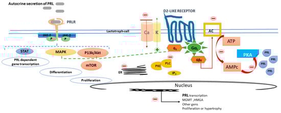 Classically, PRL is known to activate the peripheral prolactin receptor (PRLR), promoting proliferation and inhibiting apoptosis linked to its main function of milk production and breast development. How autocrine/paracrine or endocrine PRL levels collaborate with oncogenes to foster tumourigenesis, e.g., in breast tissue, but also in other hormonally responsive cancers, is not well understood [35]. In this section, we will focus on PRL central action in the pituitary gland and the main recognised downstream pathways activated after prolactin binding to its receptor on lactotroph cells.