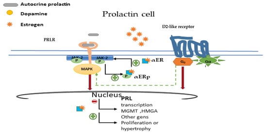 The regulation of the lactotroph cell is manly by D2R [34] (Figure 3).