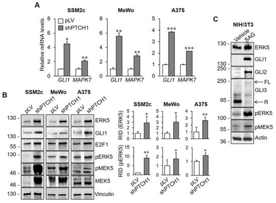 Lentiviruses were produced in HEK-293T cells as previously reported []. Lentiviral vectors for stable knockdown of MAPK7 or GLI1 in melanoma cells were TRC1.5-pLKO.1-puro vector containing shRNA sequences (shNT), or target-specific sequences (Supplementary Table S3). Transduced cells were selected with 2 µg/mL puromycin for at least 72 h. Lentiviral vectors for stable knockdown of PTCH1 in melanoma cells were pLV-CTH (pLV) and pLV-CTH-shPTCH1 (shPTCH1) [] (Supplementary Table S3). Cells were transduced with pLV or shPTCH1 express green fluorescent protein (GFP) and were sorted using a FACS-Aria cell sorter (Beckton & Dickinson).
