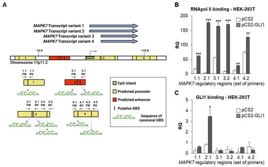2.2. GLI1 Overexpression Increases RNA Polymerase Type II (RNApol II) Recruitment at MAPK7 Promoter and Results in Increased Binding of GLI1 to MAPK7-Regulatory Regions