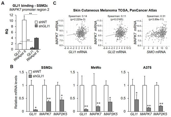 GLI1 silencing reduces RNApol II recruitment at and GLI1 binding to MAPK7 promoter and decreases MAPK7 and MAP2K5 mRNA levels. (A) SSM2c cells were lysed 5 days after transduction with pLKO.1-puro vectors containing non-targeting sequence shRNA (shNT) or lentiviral vectors carrying GLI1-specific shRNA (shGLI1), and ChIP was performed using anti-RNApol II, anti-GLI1 antibody, or isotype control IgG. Q-PCR for region 2 of MAPK7 promoter was performed. Histograms represent the relative quantification (RQ) of DNA recovered from IP with RNApol II or GLI1 normalized for isotype control IgG. Data shown are mean ± SD. ** p < 0.01, as determined by Student’s t-test. (B) Melanoma cells were lysed 5 days after transduction with pLKO.1-puro vectors containing non-targeting sequence shRNA (shNT) or lentiviral vectors carrying GLI1-specific shRNA (shGLI1), and GLI1, MAPK7, and MAP2K5 mRNA levels determined by Q-PCR. Data shown are mean ± SD from three independent experiments. * p < 0.05, ** p < 0.01 as determined by Student’s t-test. (C) Correlations between the indicated mRNA as determined using the co-expression tool in cBioPortal for Cancer Genomics (Skin Cutaneous Melanoma TCGA, PanCancer Atlas, 448 patients) [,]. Data are represented by scatter plots showing Spearman’s correlation.