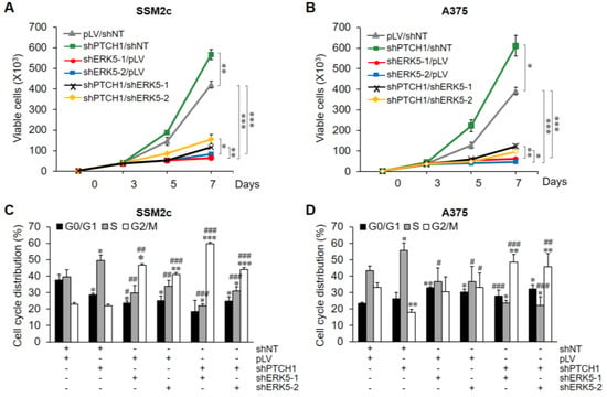 Based on the fact that HH-GLI signalling controls the expression of ERK5, we investigated whether ERK5 is involved in HH-GLI-dependent proliferation. To this end, we evaluated the effect of MAPK7 silencing on HH-GLI-dependent proliferation induced by PTCH1 silencing in melanoma cells. In both SSM2c (Figure 4A) and A375 (Figure 4B) cells, pLV-shPTCH1 increased the number of viable cells after 7 days of incubation compared with pLV control, whereas MAPK7 silencing, obtained by transducing cells with pLKO-shERK5-1 and pLKO-shERK5-2 lentiviruses, reduced it. Interestingly, MAPK7 genetic inhibition abrogated the increase of cell numbers induced by activation of the HH-GLI pathway (Figure 4A,B). Consistent with the above results, cell cycle analysis showed that HH-GLI pathway activation determined an increase of the percentages of cells in the S phase (Figure 4C,D), and that this increase was abrogated by genetic inhibition of MAPK7. Additionally, MAPK7 knockdown resulted in a marked cell accumulation in G2/M phase, at the expense of those in G0/G1 and S phases in SSM2c cells, while it increased the fraction of cells in G0/G1 phase in A375 cells. These results are well in keeping with the effects obtained by ERK5 pharmacological inhibition, as previously reported []. Together, these data indicate that ERK5 is critical in sustaining the proliferation of melanoma cells induced by HH-GLI signalling.