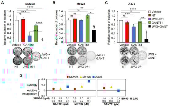Combined pharmacological inhibition of HH-GLI and ERK5 pathways synergistically reduces melanoma cell proliferation. Colony formation assays were performed in SSM2c (A), MeWo (B), and A375 (C) untreated (NT) cells or cells treated with DMSO (Vehicle), JWG-071 (1 μM), or GANT61 (1 μM), alone or in combination (JWG + GANT). Histograms represent mean ± SD from three independent experiments. Representative images of plates are shown. * p < 0.05, ** p < 0.01, *** p < 0.001, **** p < 0.0001 as determined by Student’s t-test. § Bliss independence score (>0) indicates synergistic effects over single treatments. (D) Cell viability assay was performed on SSM2c, MeWo, or A375 cells treated with DMSO (Vehicle) or with the indicated treatment for 72 h. MTT assay was performed in three independent experiments. In the graph are indicated the bliss independence scores for all drug combinations. Bliss score > 0 indicates synergism, = 0 additivity, < 0 antagonism.