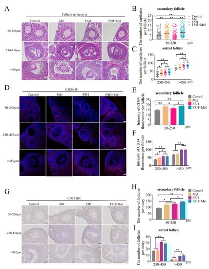 To assess the effects of melatonin (Mel) on follicle growth, we explored the development of ovarian follicles and the growth of periphery blood vessels using Mel treated mice. In addition, as we all know, the development of follicles is mainly regulated by the pituitary follicle-stimulating hormone (FSH) under physiological conditions. Then we used FSH supplement as a positive reference. The number of ovarian follicles was analyzed in each group after hematoxylin-eosin (H&E) staining. As shown in Figure 1H,I, compared with the control group, the number of 50–250 μm follicles (secondary follicles) in the Mel group increased significantly (p < 0.05), while the number of other types of follicles had no significant difference. Consistently, the number of 50–250 μm follicles in the FSH+Mel group increased significantly compared with the FSH group (p < 0.05) (Figure 1H), indicating that Mel facilitated secondary follicles development. The number of follicles of 250–450 μm and >450 μm in the FSH and FSH+Mel group increased prominently compared with the control and Mel group (p < 0.01) (Figure 1I), suggesting FSH remarkably increased the number of antral follicles. Since angiogenesis is indispensable to the development of follicles, we next investigated whether Mel influence the growth of blood vessels around the developing follicles. The erythrocytes around follicles and the expression of vascular endothelial progenitors CD34 [] was detected by immunohistochemistry (IHC) and immunofluorescence (IF). As shown in Figure 1A–G, the count of erythrocytes around 50–250 μm follicles in Mel and FSH+Mel group increased significantly compared with the control group (p < 0.01), but there was no significant difference in FSH group compared with the control group (p > 0.05) (Figure 1A,B). Similarly, the expression of CD34 in 50–250 μm follicles in Mel and FSH+Mel group increased very significantly compared with the control group (p < 0.01) and increased significantly compared with FSH group (p < 0.05) (Figure 1D,E), showing Mel was conducive to angiogenesis around secondary follicles. In antral follicles (above 250 μm), both the number of erythrocytes and the expression of CD34 increased very significantly in FSH and FSH+Mel group compared with the control group (p < 0.01) (Figure 1A,C,D,F), demonstrating FSH stimulated the development of blood vessels. Thus, these findings suggested that Mel and FSH acted in different follicular development period.