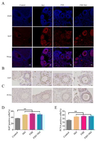 Follicular development relies on cell proliferation in the ovary. Cells proliferation need hormones regulation []. Mel and FSH are endogenous hormones exist in follicular fluids []. FSH protects mouse granulosa cells from oxidative damage [] and promotes the proliferation []. Whether Mel strengthens cell proliferation in ovary, the protein level of Ki67 and PCNA (proliferating cell nuclear antigen), two proliferation markers [], were determined by IF and IHC. As shown in Figure 2, the expression of Ki67 in secondary follicles in Mel, FSH and FSH+Mel group was significantly increased in comparison to the control group (p < 0.01) (Figure 2A,B,D). The expression of PCNA emerged the analogous result (Figure 2C,E).