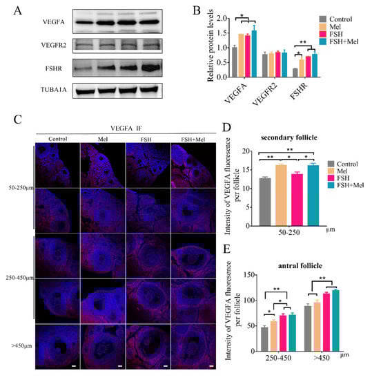 Vascular endothelial growth factor (VEGF), also called VEGFA, as one of the prime candidates regulating ovarian blood vessel formation, acts through one of its two receptors or both [,]. To evaluate the effect of Mel on angiogenesis whether through VEGF pathway, the expression of VEGFA and VEGF receptor 2 (VEGFR2) was tested by Western blotting (WB) and immunofluorescence (IF). Results showed that the expression of VEGFA in the ovary was significantly increased in the Mel group, FSH group, and FSH+Mel group compared with the control group (p < 0.05) (Figure 3A,B). There was no significant difference between the groups of VEGF receptor 2 (VEGFR2) (Figure 3A,B). Further evidence for a role of VEGF in the regulation of gonadotropin-dependent ovarian follicular angiogenesis and folliculogenesis []. Then we measured the protein level of FSH receptor (FSHR). As shown in Figure 3A,B, compared with the control group, the expression of ovarian FSHR in the Mel group was significantly increased (p < 0.05), extremely significant increase in FSH group and FSH+Mel group (p < 0.01) (Figure 3A,B). To further investigate the effect of Mel on which stage of VEGFA expression, we used IF technology to detected the developing follicles. Results indicated that the expression of VEGFA in the 50–250 μm follicles of the Mel group and FSH+Mel group was significantly increased compared with the control group (p < 0.01) (Figure 3C,D). In antral follicles, the expression of VEGFA in FSH group and FSH+Mel group increased very significantly compared with the control group (p < 0.01) (Figure 3C,E). Compared with the control group, the expression of VEGFA in 250–450 μm follicles in Mel group increased significantly (p < 0.05), but there was no significant difference of >450 μm follicle (Figure 3C,E). These results suggested that Mel mainly increased the expression of VEGFA in secondary follicles, in according with the angiogenesis and CD34 findings. Concomitantly, FSH primarily enhanced the expression of VEGFA in antral follicles.