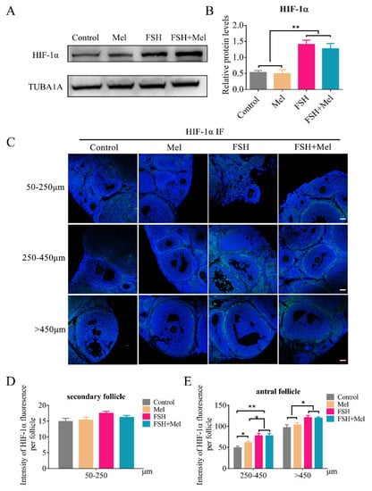 As a transcription factor regulating VEGFA, hypoxia-inducible factor 1-alpha (HIF-1α) can be involved in the modulation of angiogenesis. Subsequently, the expression of HIF-1α was determined by Western blotting. As shown in Figure 4A,B, the protein level of HIF-1α in Mel group had no significant difference compared with the control group (Figure 4A,B). Actually, FSH significantly promoted the expression of HIF-1α (Figure 4A,B). Furtherly, the expression of HIF-1α in all stages of follicles was detected by IF technology. It was verified that Mel did not affect the HIF-1α expression level in secondary follicles (50–250 μm follicles) (Figure 4C,D). While we also found that FSH did not influence the expression of HIF-1α in secondary follicles either (Figure 4C,D). In addition, we discovered that the expression of HIF-1α in the FSH group and FSH+Mel group increased significantly compared with the control group around antral follicles (Figure 4C,E), indicating that FSH modulated antral follicular angiogenesis may through the HIF-1α/VEGF signaling pathway.