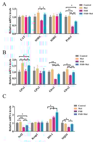 Mel promoted the expression of VEGFA in secondary follicles, but it did not improve HIF-1α expression level, hence, Mel regulated angiogenesis may not through the HIF-1α/VEGF signaling pathway in secondary follicles. Then the mechanism of Mel promoted secondary follicle VEGF expression and angiogenesis need to be further explored. Mel, as a potent antioxidant, can directly act or indirectly function by activating antioxidant enzymes. Subsequently, the expression of antioxidant enzymes in mRNA levels was examined. As shown in Figure 5, the glutathione peroxidase-1 (Gpx1) and heme oxygenase-1 (HO-1) mRNA expression levels were significantly up-regulated in the Mel group in comparison to the control group (p < 0.05) (Figure 5A–C). Besides, we found that the expression of peroxiredoxin-3 (Prdx3), glutaredoxin 1 (Glrx1), glutaredoxin 2 (Glrx2), nuclear factor erythroid 2-related factor 2 (Nrf2) and NAD(P)H-quinone oxidoreductase 1 (NQO1) in the FSH group was significantly down-regulated (p < 0.05) (Figure 5A–C), while only HO-1 in the FSH group was significantly up-regulated (p < 0.05) (Figure 5C) compared with the control group. Furthermore, we discovered that the expression of superoxide dismutase 1 (SOD1), Prdx3, Gpx1, Glrx1, Glrx2, Nrf2 and NQO1 in the FSH+Mel group was conspicuously increased compared with the FSH group (p < 0.05) (Figure 5C). In general, while FSH promotes the rapid development of follicles, it will exhaust the antioxidant capacity of ovarian tissue and related antioxidant enzymes. Mel supplement can relieve this situation to a certain extent.