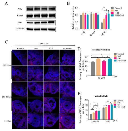 Heme oxygenase-1 (HO-1) was regulated through the nuclear factor erythroid 2-related factor 2 (Nrf2) binding to antioxidant response element (ARE) sequence protecting against oxidative injury and contributing to angiogenesis. Then the expression of HO-1, Nrf2 and Keap1 was determined by Western blotting. As shown in Figure 6A,B, the HO-1 protein level in ovary in the Mel group had a significant increment compared with the control group (p < 0.05), consistent with the mRNA result (Figure 5C). However, with the expression of Nrf2 and Keap1 in the ovary, there was no significant difference between the groups (Figure 6A,B). Moreover, the expression of HO-1 in ovary of the FSH group and FSH+Mel group significantly increased compared with the control group (p < 0.05) (Figure 6A,B), indicating that Mel and FSH induced increase of HO-1 protein is not carried out through the Nrf2 signaling pathway. Furthermore, the expression of HO-1 in developing follicles was detected by immunofluorescence. As shown in Figure 6C,D, in secondary follicles, compared with the control group, the expression of HO-1 in the Mel and FSH+Mel group was significantly increased (p < 0.05), but there was no significant difference in the FSH group (Figure 6C,D). Further, in antral follicles, the expression of HO-1 in the FSH and FSH+Mel group was obviously increased compared with the control group (p < 0.01) (Figure 6C,E).
