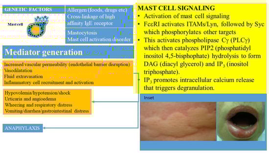 Mast cell activation can occur following many triggers and via a plethora of cell surface receptors, including receptors for IgE, IgG, complement, cytokines, growth factors, stem cell factor, and neuropeptides (beyond the scope of this review) [,,]. The prototypic IgE-mediated activation (Figure 1) occurs when allergen specific IgE is bound by a multivalent allergen and interacts with the high affinity receptor for immunoglobulin E (FcεR1) carried on their surfaces [,]. The high affinity receptor for IgE has a heterotetrametric structure, comprising an α-chain (binds IgE), a β-chain (plays a key role in signal transduction), and two γ-chains (that initiate signaling post-activation) []. This process activates a downstream signaling cascade (summarized in Figure 1) involving immunoreceptor tyrosine-based activation motifs (ITAMS) associated with the β- and γ-chains. The activation of tyrosine protein kinase Lyn leads to phosphorylation of Syc. Subsequent activation of phospholipase Cγ (PLCγ) catalyzes PIP2 (phosphatidyl inositol 4,5-bisphophate) hydrolysis to form DAG (diacyl glycerol) and IP3 (inositol triphosphate). IP3 promotes intracellular calcium release that triggers degranulation. This culminates in the release of preformed and neosynthesized mediators from mast cells and basophils that set off a sequence of inflammatory events manifesting clinically as anaphylaxis and leading to distributive shock (Figure 1). Genetic factors such as polymorphisms in the angiotensin converting enzyme, HαT, platelet activating factor defects (such as deficiencies of platelet activating factor acetyl hydrolase), cytokine gene polymorphisms, and the KARS mutation may modulate the severity of such reactions.