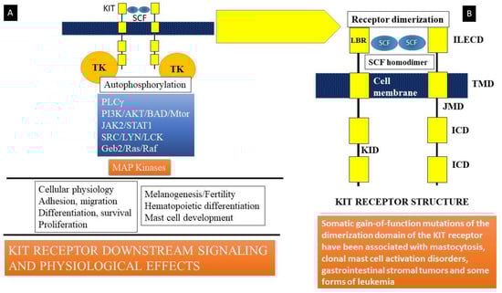 Stem cell factor (SCF) is a hematopoietic growth factor bound to its receptor, KIT, a transmembrane tyrosine kinase-linked receptor on mast cells [,]. KIT is the cellular counterpart of the v-KIT oncogene derived from the feline leukemia virion. It is encoded in the W or c-KIT locus on human chromosome 4q11-q12. KIT (Figure 2) is composed of an immunoglobulin-like extracellular domain (ILECD with five components) that is involved in ligand (SCF) binding, an anchoring transmembrane domain (TMD), a juxta-membranous domain (JMD), an intracellular domain (ICD), and a kinase insert domain (KID). The binding of stem cell factor to KIT results in receptor dimerization and the activation of protein kinase activity. Signaling downstream involves the activation of key kinases, such as phospholipase Cγ (PLCγ), protein kinase C (PKC), and linked signaling proteins such as Janus kinase 2 (a non-receptor tyrosine kinase or JAK2), signal transducer and activator of transcription 1 (STAT1), and others. These mechanisms lead to the action of mitogen-activated protein kinases (MAP kinases), resulting in multiple cellular effects such as adhesion, migration, differentiation, survival, and proliferation of mast cells (Figure 2). Somatic mutations in c-KIT that code for the KIT receptor have been linked to the development of systemic mastocytosis, a clonal hematological disorder. The most common of these mutations is the D816V mutation that leads to enhanced survival and proliferation of mast cells, a feature of clonal mast cell disorders, including mastocytosis and mast cell activation disorders.