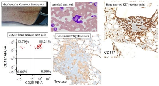 - Reichard, K.K.; Chen, D.; Pardanani, A.; McClure, R.F.; Howard, M.T.; Kurtin, P.J.; Wood, A.J.; Ketterling, R.P.; King, R.L.; He, R.; et al. Morphologically occult systemic mastocytosis in bone marrow: Clinicopathologic features and an algorithmic approach to diagnosis. Am. J. Clin. Pathol. 2015, 144, 493–502. [Google Scholar] [CrossRef]