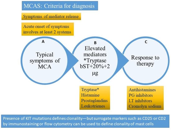 Criteria for diagnosis of mast cell activating syndrome (please refer to text for description). A = clinical criterion, B = laboratory criterion, C = treatment criterion. All three criteria need to be satisfied to confirm a diagnosis of mast cell activation syndrome (MCAS). The presence of clonality (KIT D816V mutation or surface expression of CD2 or CD25 clonal markers) would suggest a diagnosis of clonal (primary) mast cell activating syndrome also referred to as the monoclonal mast cell activation syndrome (MMAS). * Tryptase (total tryptase) is usually used as a surrogate marker for mast cell activation. PG = prostaglandin, LT-leukotriene, MCA = mast cell activation. bST = basal serum tryptase.
