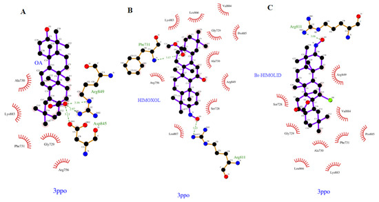 The first poses of the docked OA (A), HIMOXOL (B), and Br-HIMOLID (C) ligands with surroundings amino acids within the cavity (LigPlot+ v.2.2 software [22,23]).