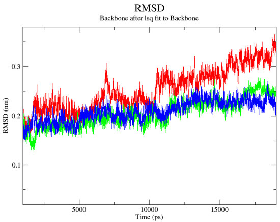 Next, the 20-ns-long molecular dynamics (MD) simulations were performed to explore the stability of binding modes of ligands in the kinase domain of HER2 protein. The time-evolution of RMSD values of the ligand in the ligand–protein complexes is shown in Figure 2.