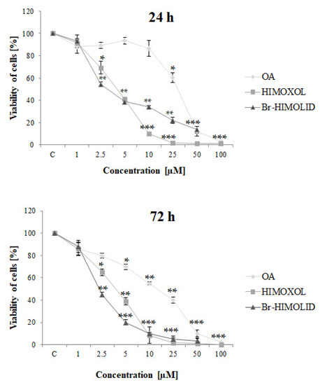 HIMOXOL and Br-HIMOLID decrease the viability of studied cells much more efficiently than the maternal compound, i.e., the 1× IC50 values for 24 h incubation time were around six times lower for the derivatives than for the OA. Similarly, 72 h incubation revealed three or four times higher toxicity of the HIMOXOL and Br-HIMOLID than OA, respectively. The effect was dose- and time-dependent, and it was shown that HIMOXOL was more cytotoxic in 24 h-treatment while Br-HIMOLID was more toxic in 72 h-treatment.